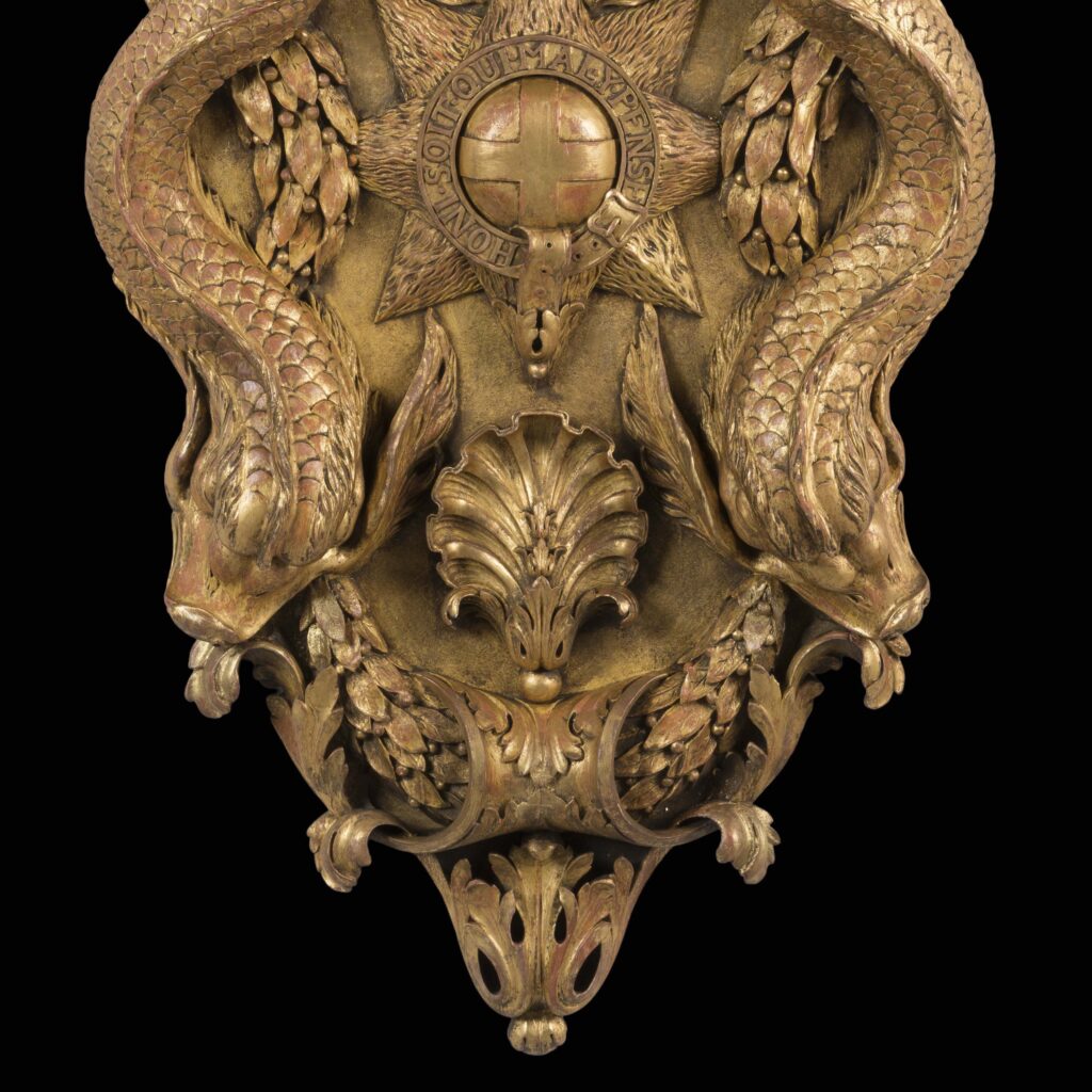 The 1-to-1 scale plaques are each carved with the feathers and motto of the Prince of Wales, as well as the Order of the Garter. They probably date from the time of the Royal Barge’s first exhibition in 1883.