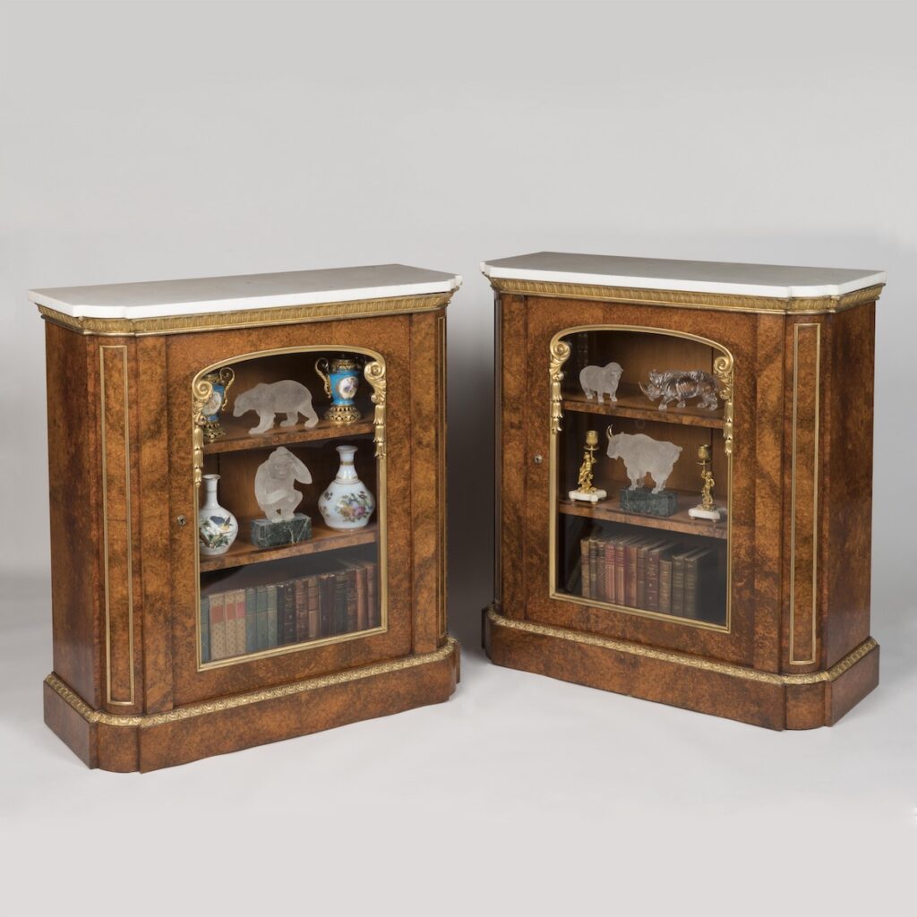 A pair of cabinets made of costly exotic amboyna both bear the original label of the cabinetmakers Thomas & George Seddon. Seddon had an illustrious history including their partnership with Nicholas Morel for the complete refurnishing of Windsor Castle, arguably the most ambitious royal commission ever in England.