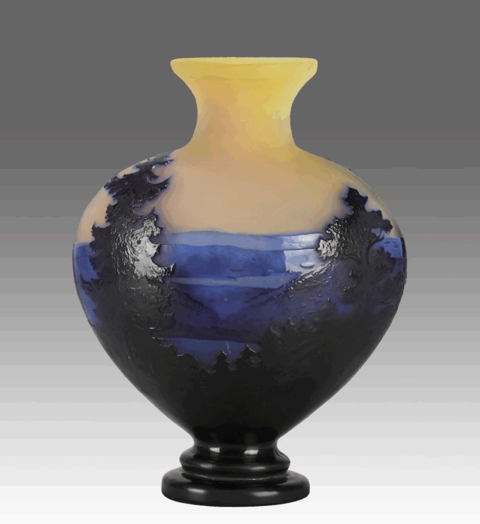 An eye-catching late 19th Century French cameo glass vase decorated with raised deep burgundy trees against a blue mountainous landscape against a variegating yellow field. Exhibiting excellent detail and colour, it stands 22.5cm high and is signed Gallé, in cameo. Image David Hickmet