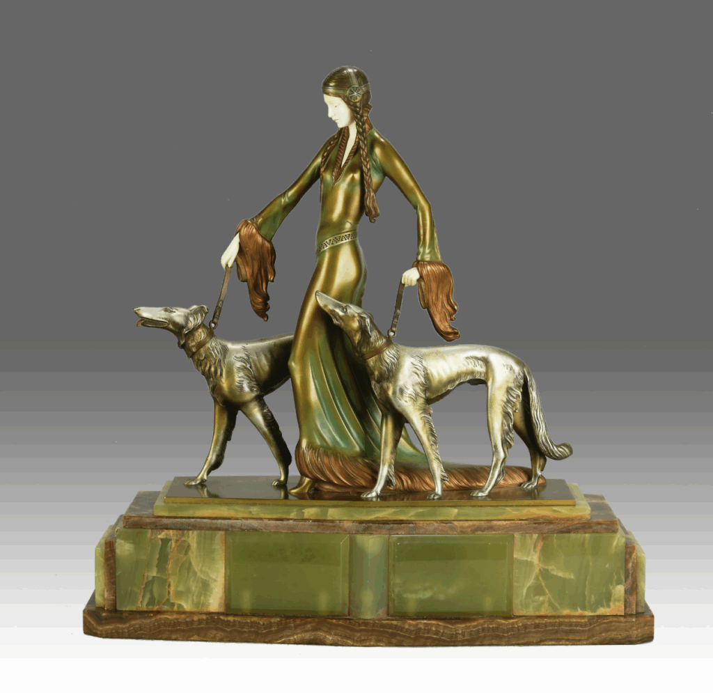 A magnificent 49cm high early 20th Century Art Deco cold painted bronze and hand-carved ivory figure of an elegant beauty wearing a loosely fitted full-length gown walking her two dogs, the sculpture with exquisite colour and intricate detail. Raised on a decorative Brazilian green and brown onyx base and signed Prof. Poertzel. Image David Hickmet